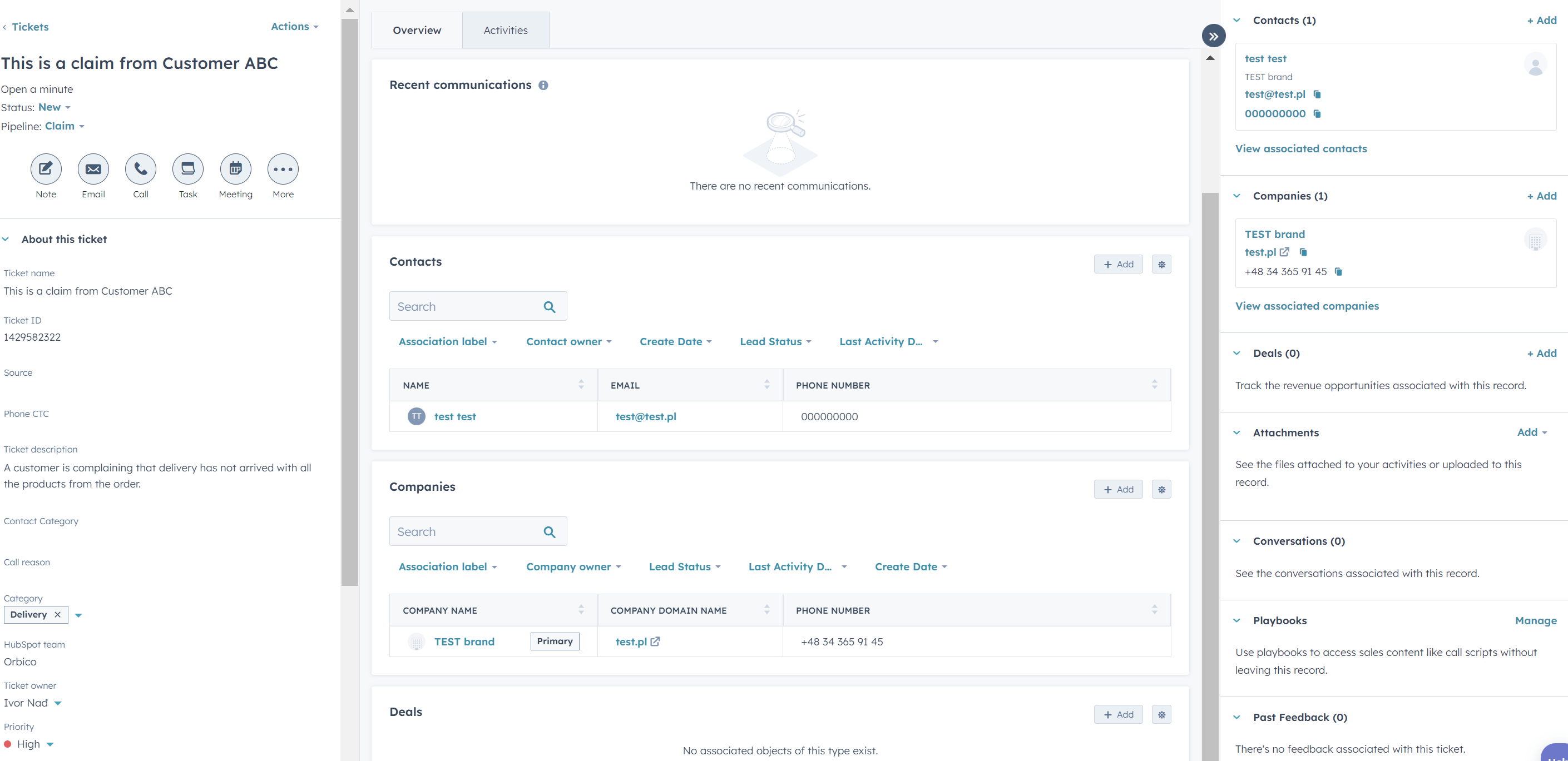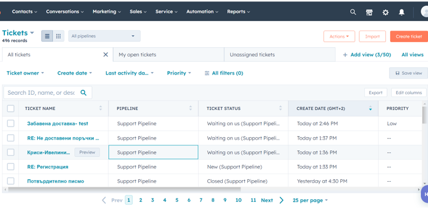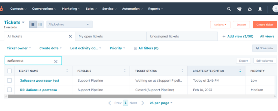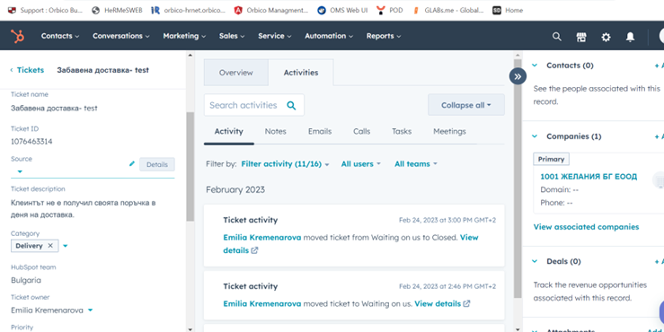 - Регистрация на тикет в Hubspot по входящо обаждане: избирате от контролната лента Service>Tickets> Create ticket
