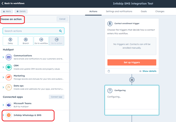 Find the Action called "Infobip Whatsapp & SMS" and select:
